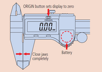 Tisztítsuk meg a párhuzamos mérőfelületeket tiszta törlőpapírral. Zárjuk egymáshoz a mérőfelületeket és ellenőrizzük, hogy a nóniusz skála (vagy kijelző) nulla értéket mutat-e. Digimatic tolómérő esetén elemcsere után minden esetben nyomja meg a nullázó gombot (ORIGIN gomb).