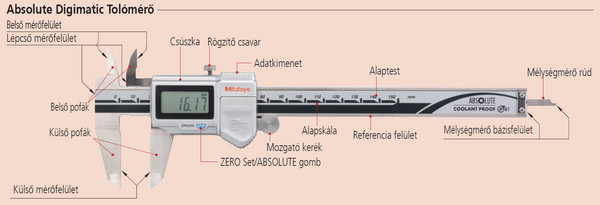 Tolómérő belső mérőfelület, Tolómérő lépcsőmérő felület, Tolómérő belső pofa, Tolómérő külső pofa, Tolómérő külső mérőfelület, Tolómérő csúszka, Tolómérő ZERO Set/ABSOLUTE gomb, Tolómérő csúszka, Tolómérő rögzítő csavar, Tolómérő adatkimenet, Tolómérő mozgató kerék, Tolómérő alaptest, Tolómérő alapskála, Tolómérő referencia felület, Tolómérő csúszka ütköző, Tolómérő mélységmérő bázisfelület, Tolómérő mélységmérő rúd.