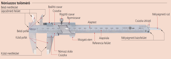 Tolómérő belső mérőfelület, Tolómérő lépcsőmérő felület, Tolómérő belső pofa, Tolómérő külső pofa, Tolómérő külső mérőfelület, Tolómérő csúszka, Tolómérő nóniusz skála, Tolómérő beállító csavar, Tolómérő csúszka, Tolómérő rögzítő csavar, Tolómérő nyomócsavar, Tolómérő mozgató elem, Tolómérő alaptest, Tolómérő alapskála, Tolómérő referencia felület, Tolómérő csúszka ütköző, Tolómérő mélységmérő bázisfelület, Tolómérő mélységmérő rúd.